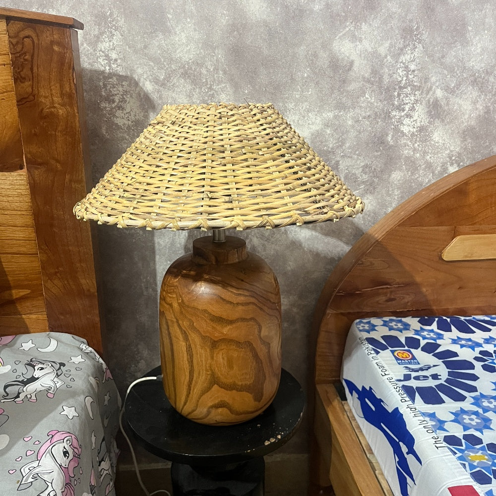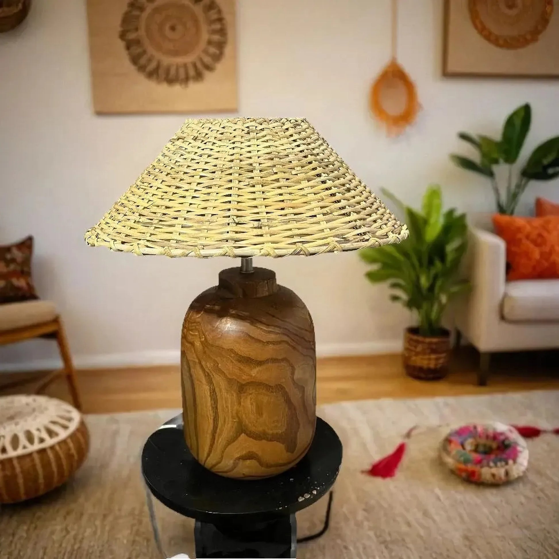 Illuminate your space with elegance and natural charm using this beautifully handcrafted table lamp. Featuring a handmade wooden base and a stunning cane lampshade, this lamp seamlessly blends rustic craftsmanship with modern design. The wooden base, crafted from solid wood, measures 8 inches in diameter and 13 inches in height, providing a sturdy foundation with a warm, natural finish. The handcrafted cane lampshade, with a 14-inch diameter and 10-inch height, adds a soft, ambient glow, perfect for creating a cozy and inviting atmosphere. This unique table lamp is ideal for living rooms, bedrooms, or any space that could use a touch of handcrafted beauty.