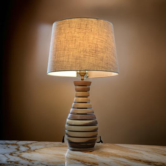 Glow up your space with this exquisitely crafted table lamp featuring a solid wood base with an elegant groove design. Standing 14 inches tall with a 6-inch diameter, the base boasts a unique groove pattern that adds depth and sophistication to its natural polish finish. Complemented by a fabric lampshade with a 12-inch diameter and a 10-inch height, this lamp provides a warm, inviting glow while serving as a striking centerpiece in any room.