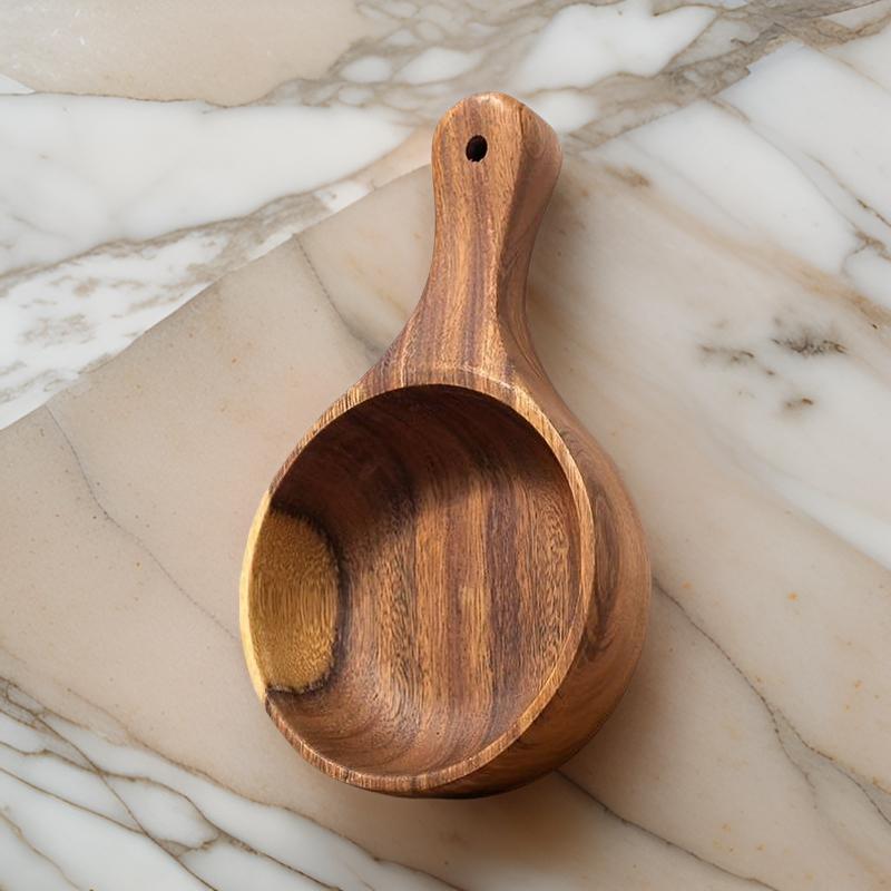 Crafted from high-quality Acacia and Lilac wood, this Wooden Salad Bowl with Handle is designed for versatility and style. Its solid wood build is perfect for serving, dressings, or multi-purpose use. The bowl features a convenient 3-inch handle, allowing for easy grip, and has a 4-inch diameter with a 3-inch height—ideal for portioned servings or sharing. Its natural wood finish adds warmth and charm to any table setting, making it a must-have for gatherings or everyday use.