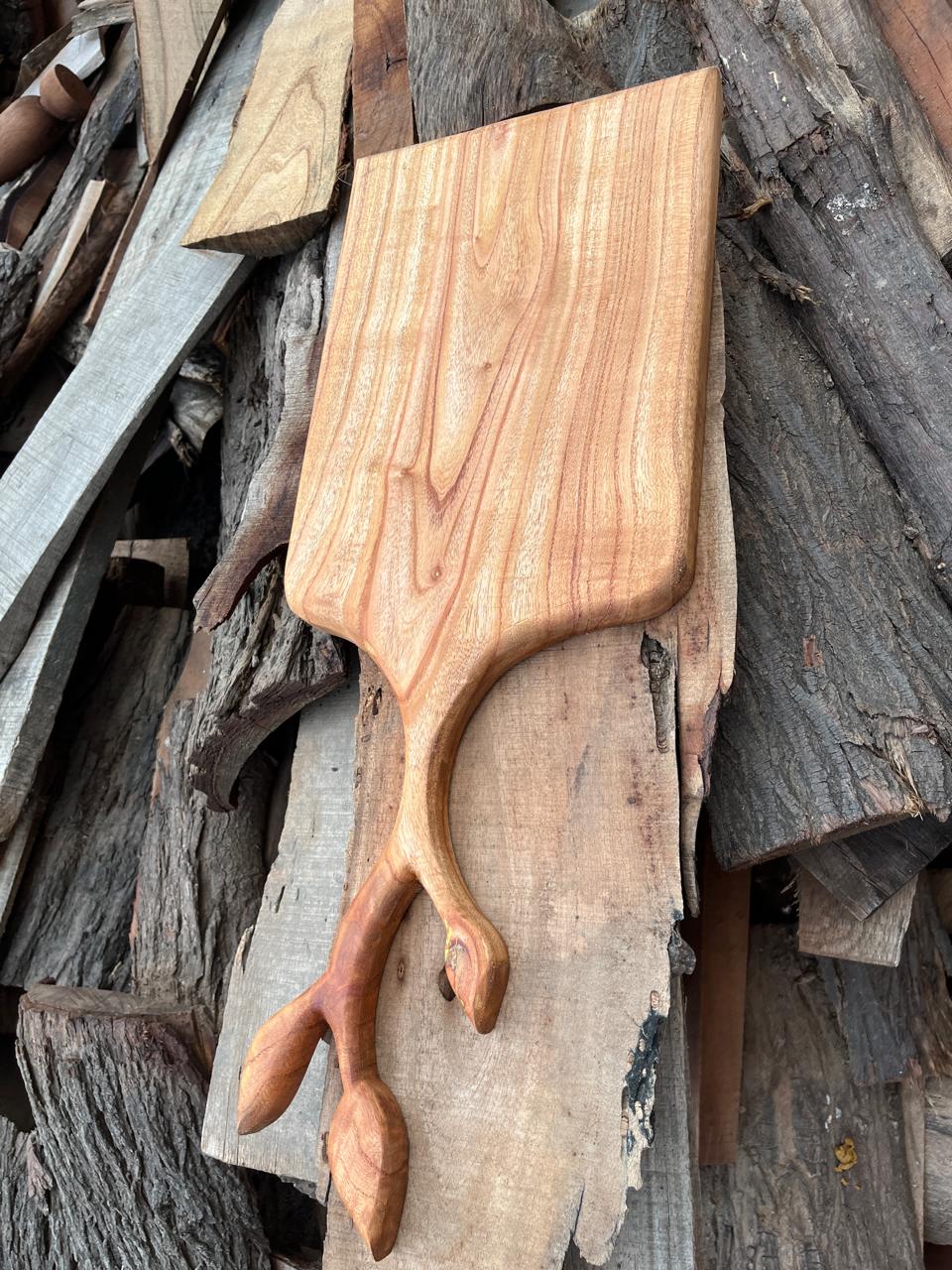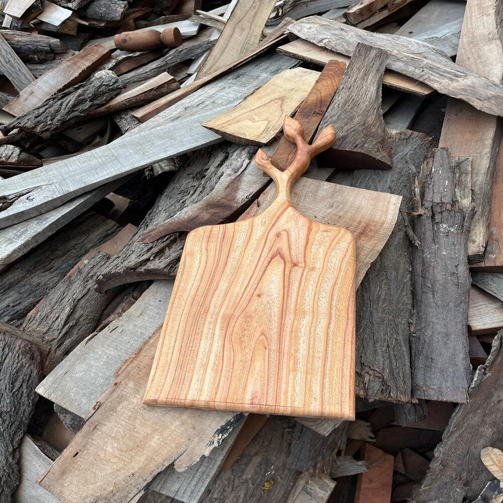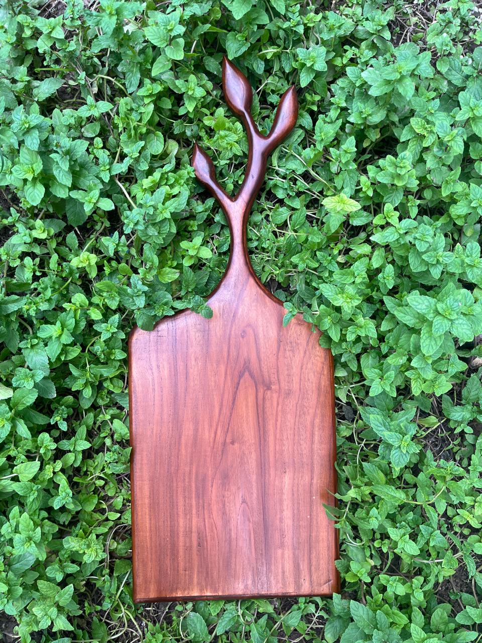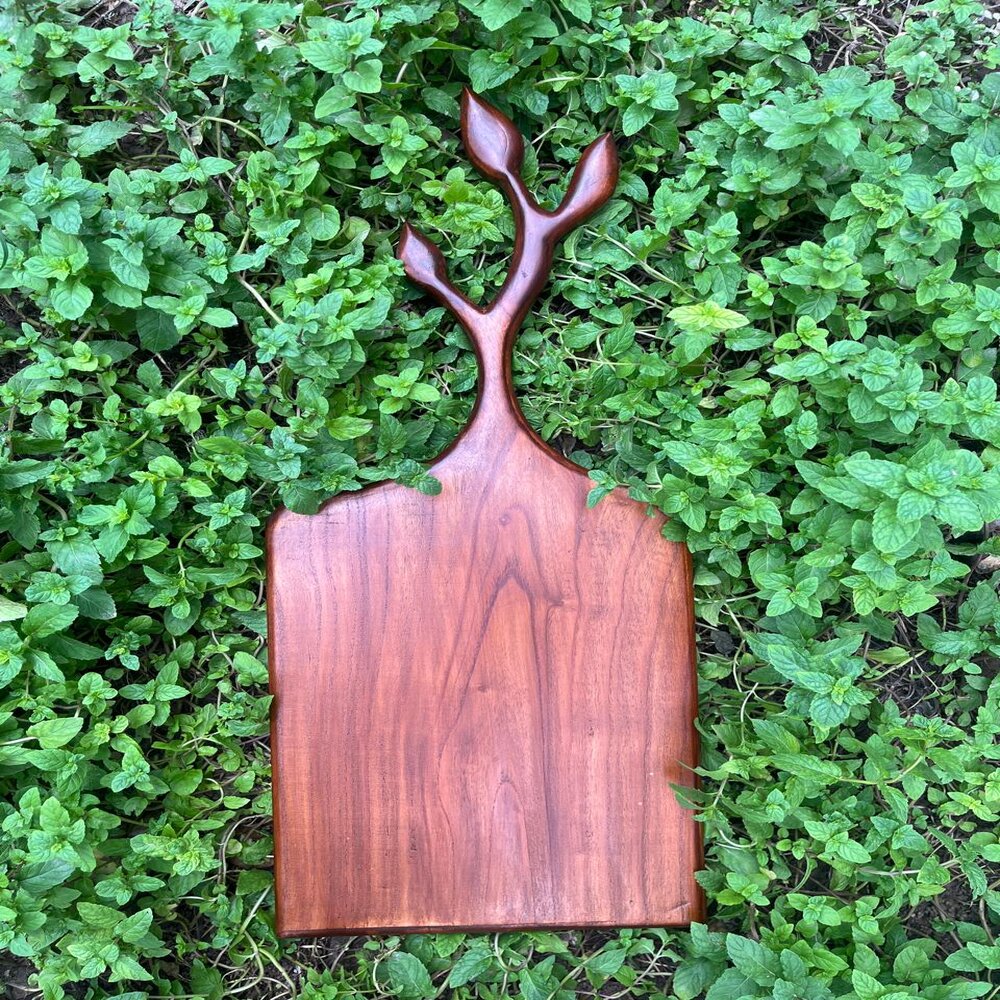 Elevate your kitchen aesthetics with this exquisite wooden cutting board featuring a unique Stag leaf handle design. Crafted with precision and available in various wood types, this cutting board is not only a practical kitchen tool but also a stunning piece of art. Measuring 10 inches wide and 22 inches in length, it provides ample space for chopping, cutting, and serving. The intricate Stag leaf handle adds a touch of elegance, making it a perfect centerpiece for your kitchen or dining area. Whether you choose it for everyday use or as a decorative item, this cutting board is designed to impress.